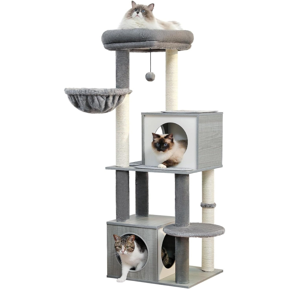 - To encourage healthy scratching and active play, the cat tree is equipped with sisal-wrapped posts that connect all the platforms. Cats can sharpen their claws while enjoying the vertical space, promoting exercise and keeping them engaged. Crafted from high-density wood, the cat tree boasts a modern look with excellent durability.