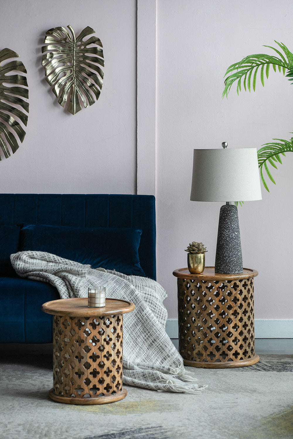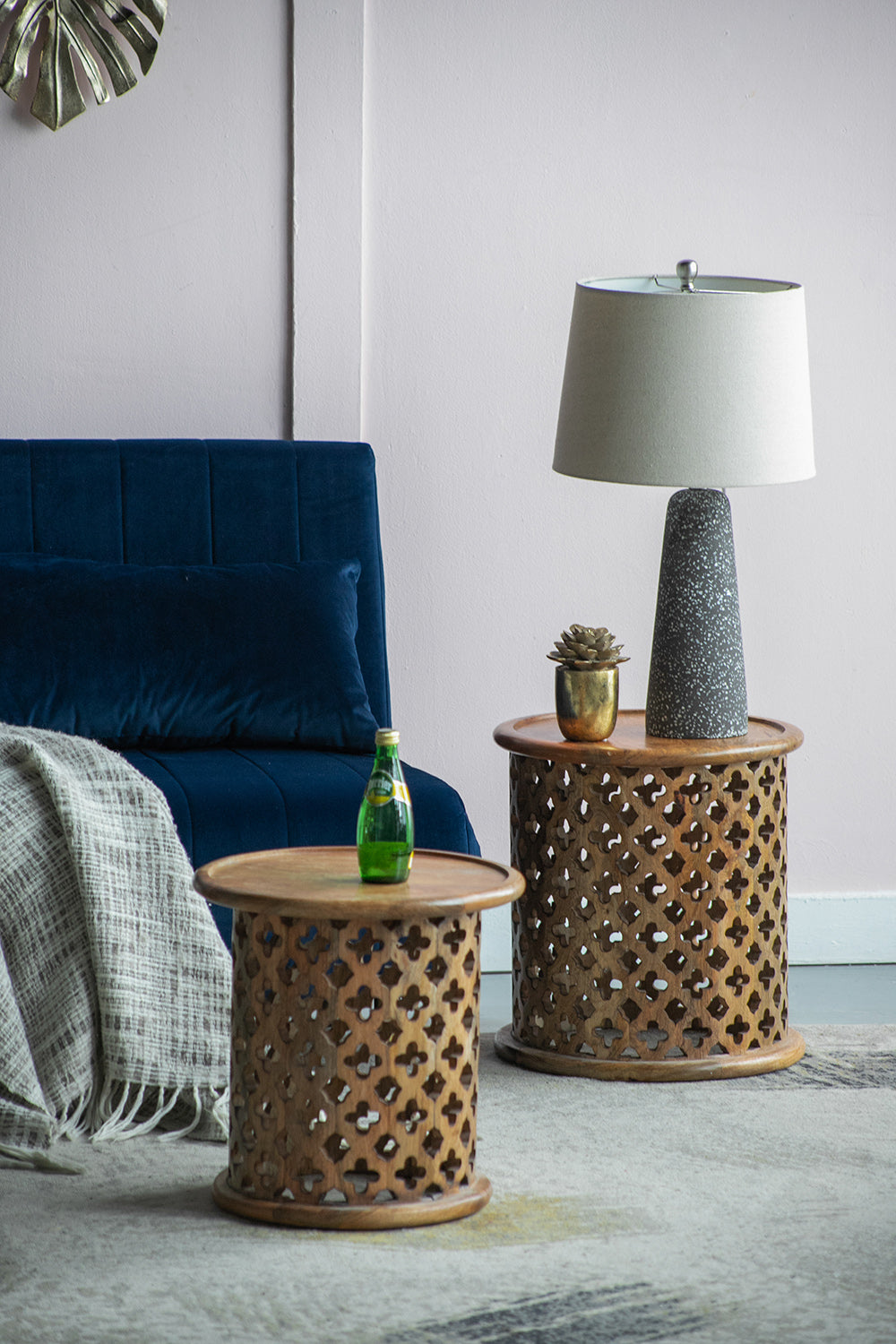 2 Piece Mango Wood Jali Side Tables Natural Burn Finish Round Accent for Living Room