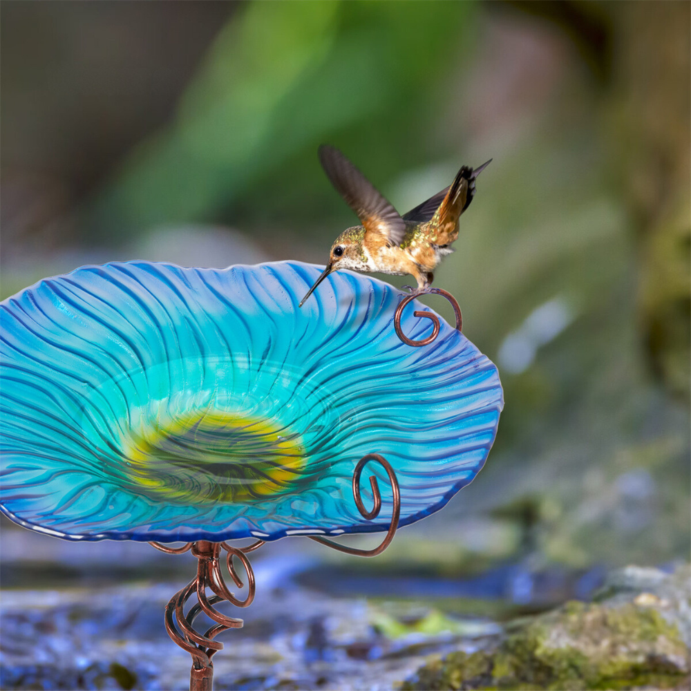 - Widely used as a bird bath or bird feeder, this glass birdbath invites birds to your garden, providing them with a source of water and food while adding life and movement to your outdoor environment. The birdbath is supported by five stakes that ensure stability and durability, keeping it firmly in place even in windy conditions.