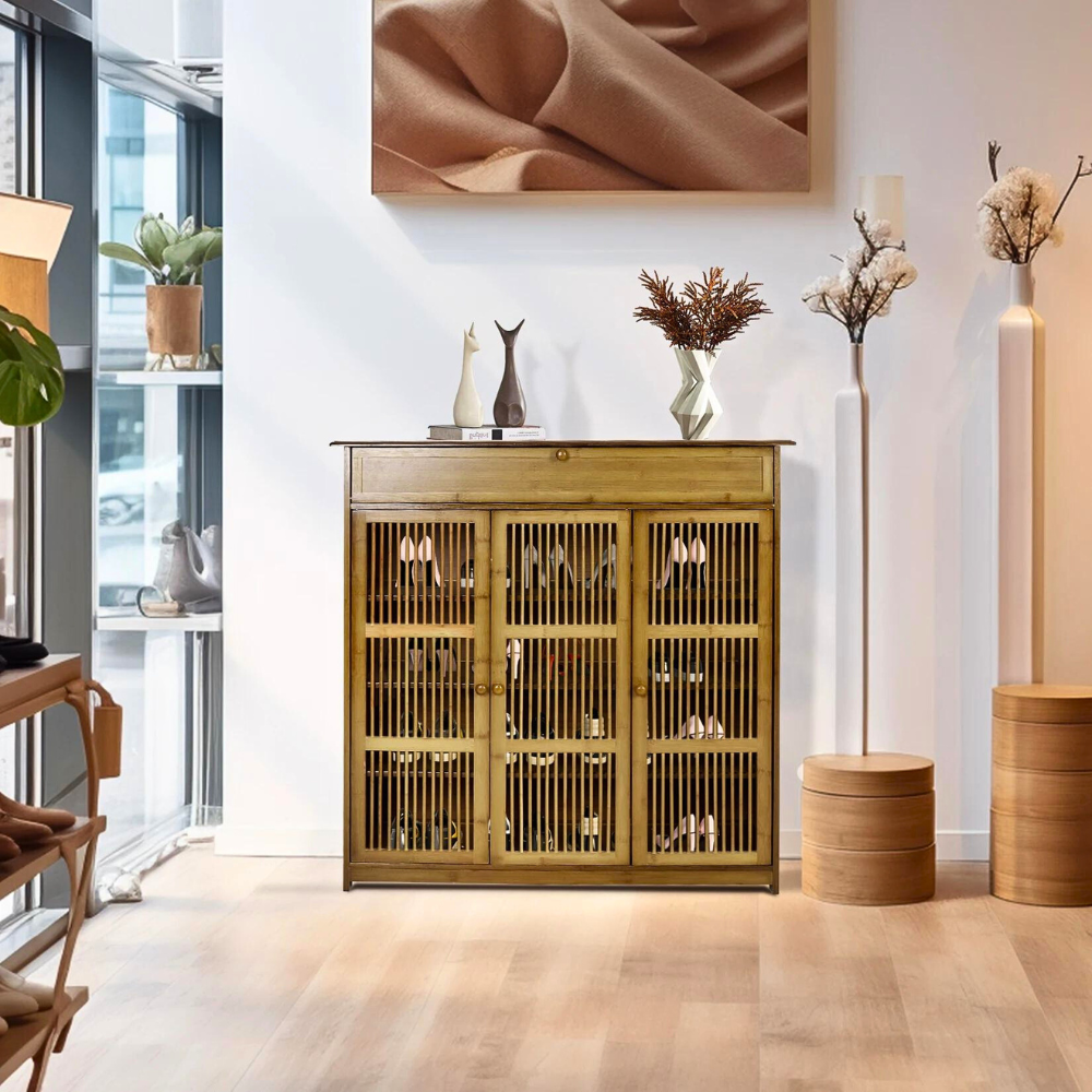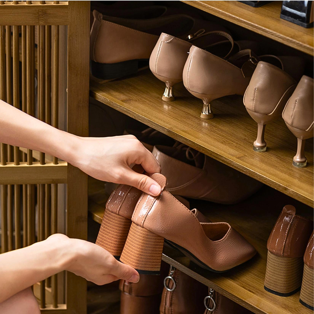 - The cabinet effectively protects shoes from sunlight and dust while ensuring proper air circulation. It is equipped with three ventilated doors that keep your shoes smelling fresh and easily accessible. The doors are fitted with magnetic closures to minimize the risk of damage and have smooth wood handles for easy opening and closing.Crafted from bamboo with MDF shelves, the cabinet is strong and robust, with a smooth, polished surface that is waterproof, damp-proof, and easy to clean. Assembly is straightforward with the provided instructions.