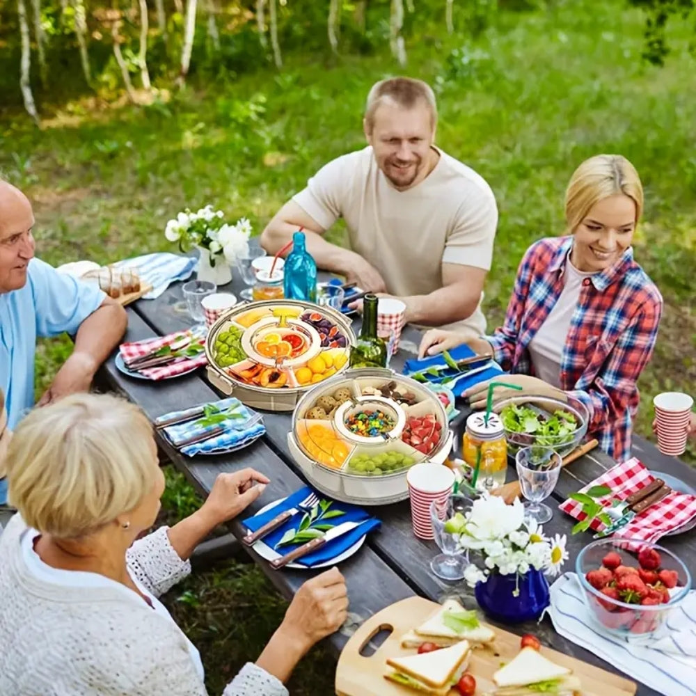 - The 6 Division Rotating Fruit Tray with Lid and Handle is the ultimate snack solution for any gathering. Designed to offer both convenience and style, this snack container is perfect for organizing and serving snacks at parties, picnics, or casual get-togethers. Its compact design, complete with a lid and handle, ensures easy storage and portability, making it a must-have for any event or occasion.