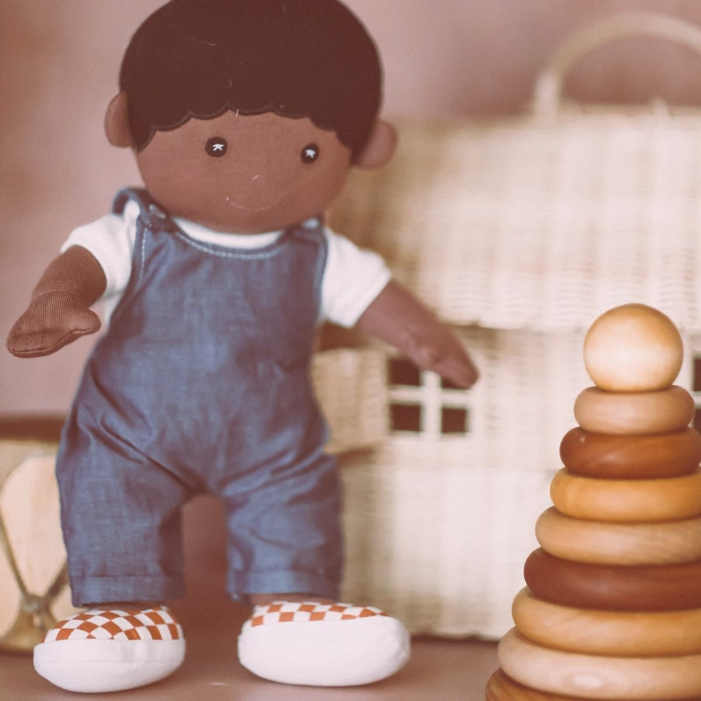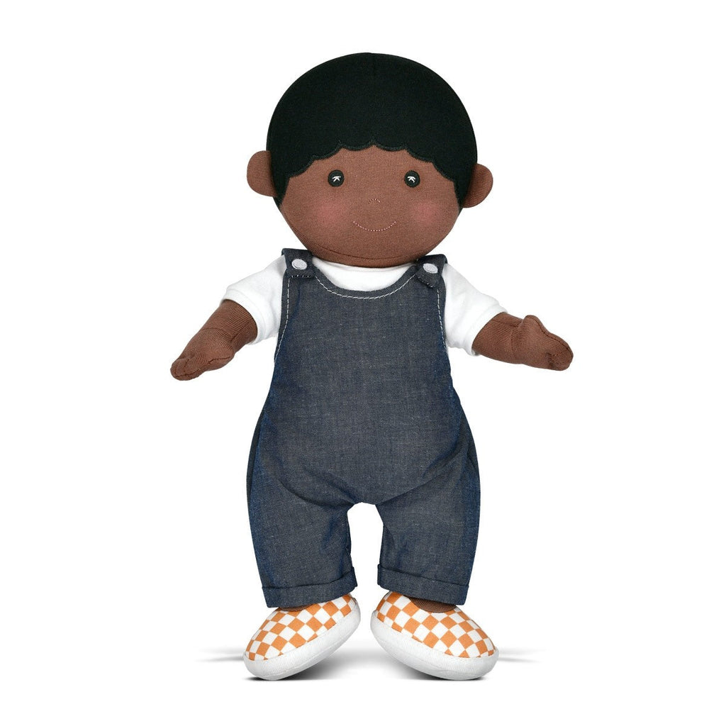 This soft and cuddly doll is made from certified organic cotton, providing a gentle and organic companion for children. The doll features removable clothes secured with soft baby Velcro, as well as a removable undergarment with an elastic waist. Finished with embroidered eyes, nose, smile, finger detailing, and a belly button, the doll also includes permanently attached booties for added charm. Filled with a blend of organic cotton and hypo-allergenic corn fibre, this doll is safe, soft, and cuddly. Presented in an open shelf box made from recycled paper printed with soy ink, it's the perfect sustainable choice.