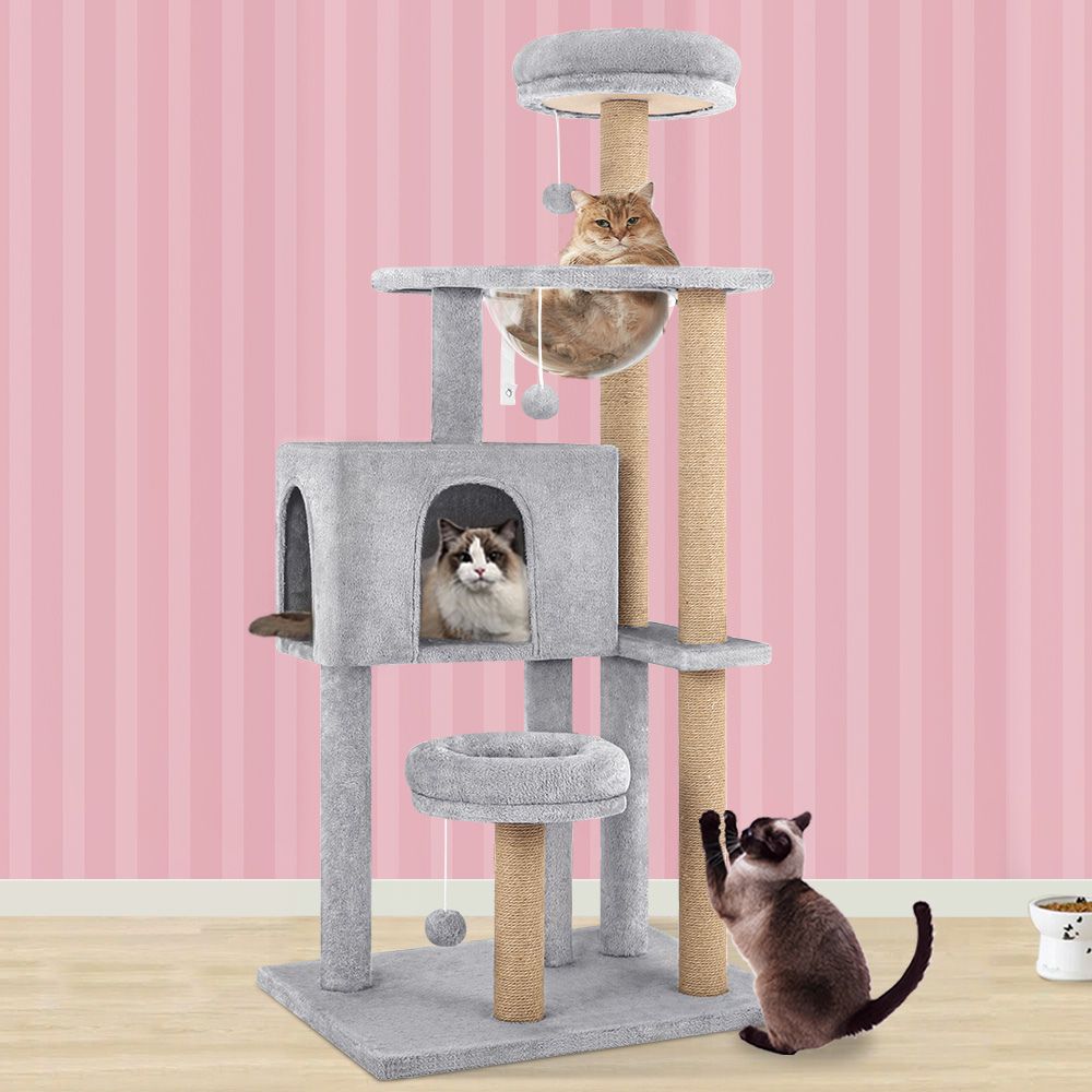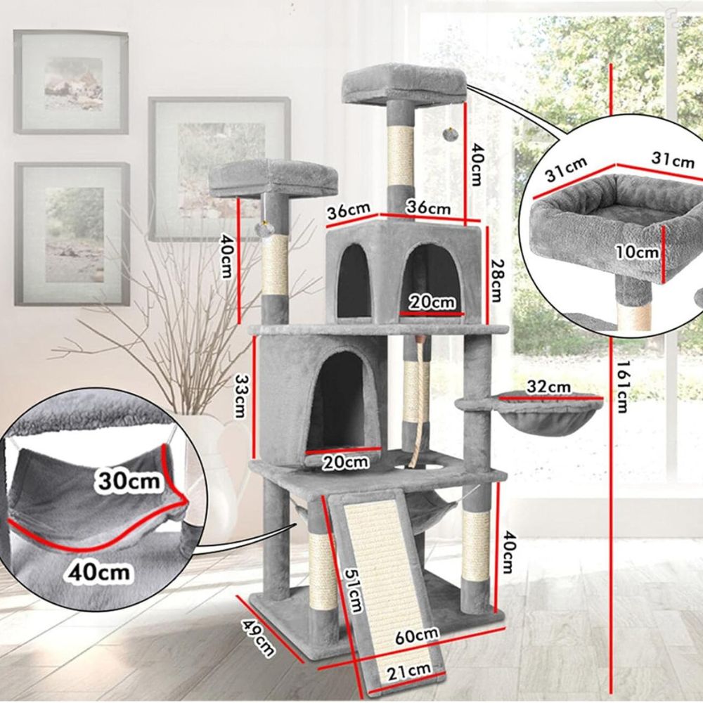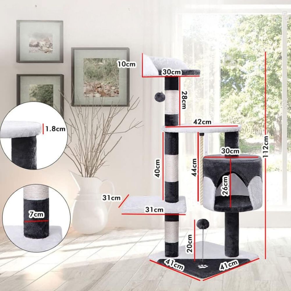 - Cat Tree is a multi-level scratching post and tower that provides the ultimate environment for your cat's comfort and play. It offers a cozy condo where your cat can rest, a comfortable bed for lounging, and a designated play area to keep them entertained. Built with a sturdy construction and a stylish design, the Cat Tree seamlessly fits into any home decor. Its neutral colours and modern look make it a versatile piece that complements your living space while meeting all your cat’s climbing and lounging needs.