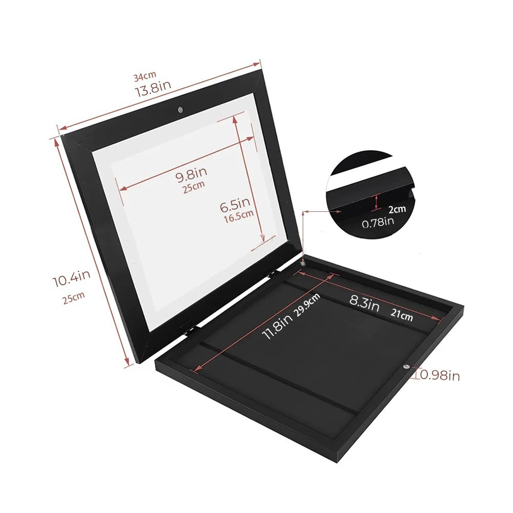 - The interior of the frame is designed with elastic bands, providing a secure storage space for up to A4 sized artworks. the frame comes with hanging hardware for easy display in both horizontal and vertical formats.