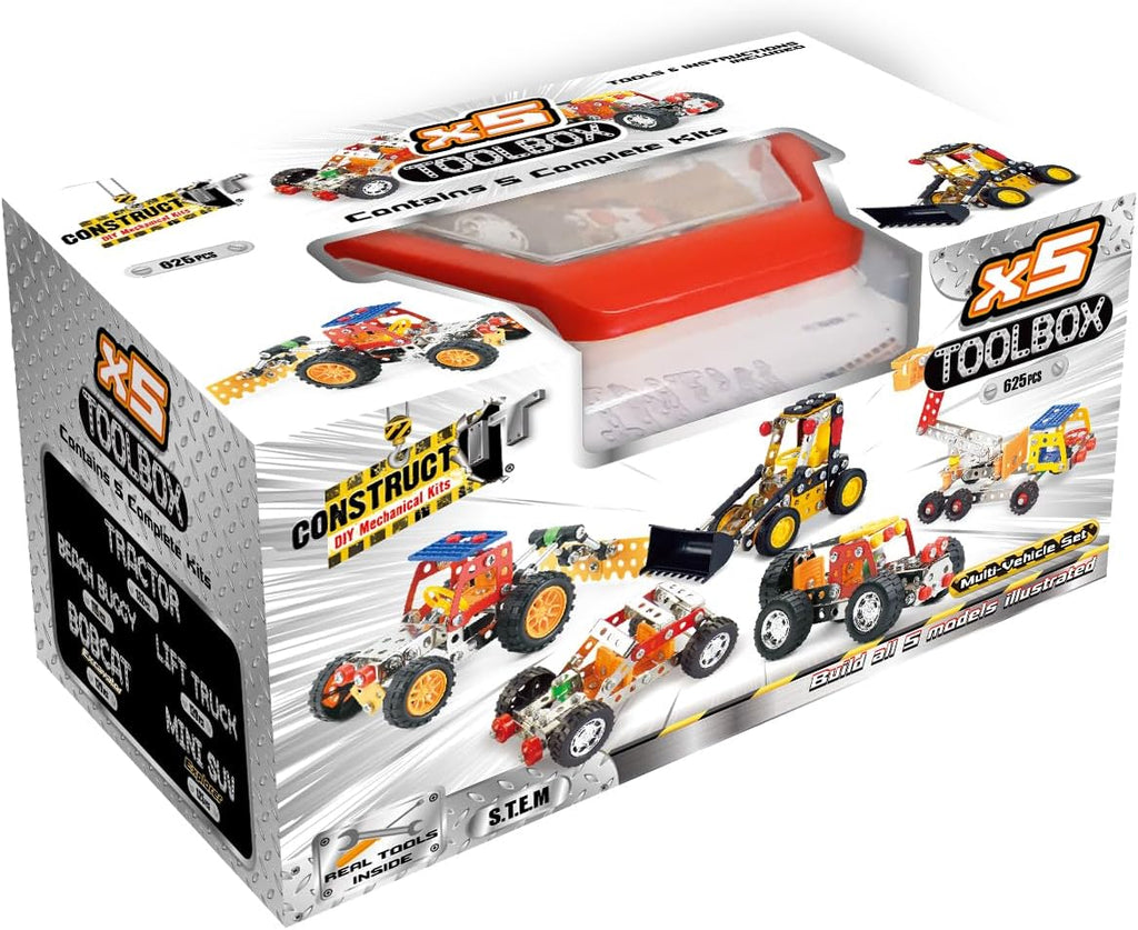 The Construct IT 5 in 1 Toolbox is an innovative metal construction toy set designed to provide endless creative possibilities and durability. This set includes five individual construction kits housed in a sturdy and portable carry case, allowing for hours of hands-on building fun. Whether you're an aspiring engineer or a DIY enthusiast, this toolbox offers a gateway into the world of metal-based construction.