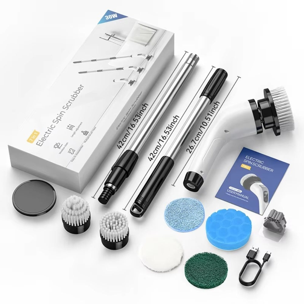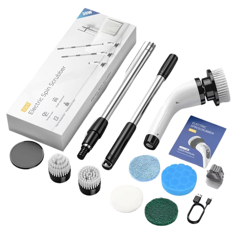 - This cordless electric cleaning brush offers a multifunctional solution for comprehensive home cleaning, particularly in bathrooms and kitchens. It is constructed from durable ABS, PC, and rubber, with a 201 stainless steel shrink rod for extended reach. The scrubber is available in black+white or gray+white appearances.