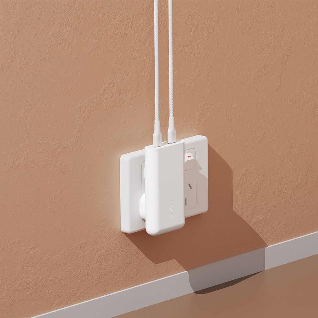 Introducing the EFM 65W Slimline Wall Charger, the ultimate powerhouse that is slim enough to fit anywhere. Its super-flat design sticks out just 25mm from the wall, making it a perfect fit behind furniture. With an impressive 65W output, it has got enough juice to charge your mobile phones, tablets, and even some laptops.Thanks to its super-efficient GaN technology, you get extremely fast, efficient and reliable charging without any bulk. Plus, the dual upward-facing ports make plugging in two cables easy and hassle-free. With the housing crafted from 100 percent post-consumer recycled materials, it is eco-friendly without compromising on performance. Powerful, compact, and sustainable û this charger does it all.