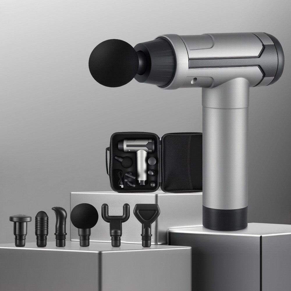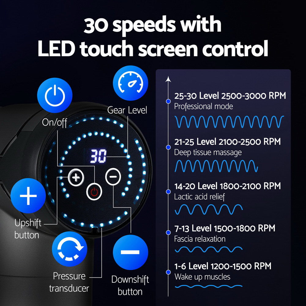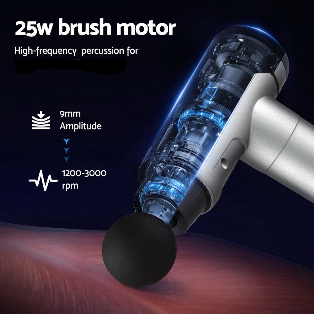 Whether you're a hard-core gym junkie, a dedicated office worker or recovering from an injury. With a powerful high-torque brushless motor, the massage gun allows for high-frequency vibration at 1200-3000 strokes per minute and penetrates deeply for muscle from the comfort of home. The massage gun uses long-lasting and efficient rechargeable lithium batteries that allow the gun to run for up to 2 hours. There are 30 speed levels to suit various purposes; from simply waking up your muscles to relieving lactic acid and assisting muscle recovery after exercising, or even intense professional-level massages. The non-slip rubber handle provides a comfortable grip to reduce hand fatigue, and the device operates quietly for a comfortable massage experience. The smart touch LED display makes it easy to customize your massage experience. With six unique head attachments, the Everfit Massage Gun can help you dissipate fatigue. Gets yours today and continue your fitness journey in comfort.