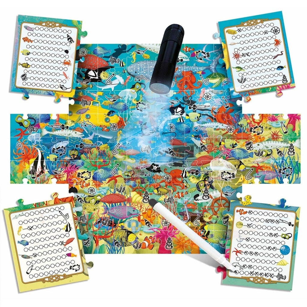 Embark on an underwater adventure with this magical sea world puzzle. Put the pieces together and explore the illustration to discover marine life in detail. Like a true scientist, children can write down their discoveries in notebooks to develop their observation skills. This kit stimulates creativity and curiosity, inspiring children to learn more about the world around them. The included magical torch allows them to observe hidden elements that are invisible to the naked eye, encouraging closer research and exploration. The kit is designed to engage multiple intelligences, promoting spatial and logical-mathematical thinking as children explore the wonders of the sea.