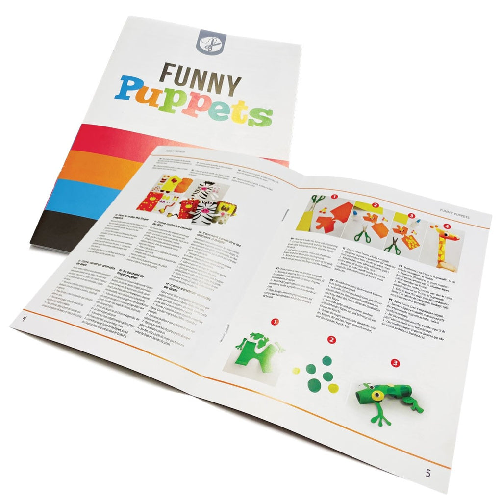 - The activity kit contains 5 paper bags, coloured cardboard, adhesive googly eyes, pompoms, adhesive paper, 4 coloured markers, 1 pair of scissors and craft glue. Also includes a detailed step-by-step illustrated instruction book that shows you how make different puppets, including smaller finger puppets. Suitable for ages 5-10 years.