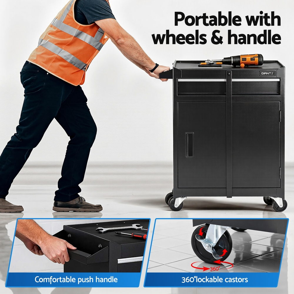 The GIANTZ tool chest is a must-have for every DIY enthusiast and professional. Made from durable powder-coated steel, this tool cabinet features a spacious drawer and a large cabinet for all your needs. With a 100kg maximum load capacity, it offers a robust storage solution. This rolling toolbox is easy to move around your workspace thanks to its sturdy casters and side handle, while its compact design helps you save floor space.
