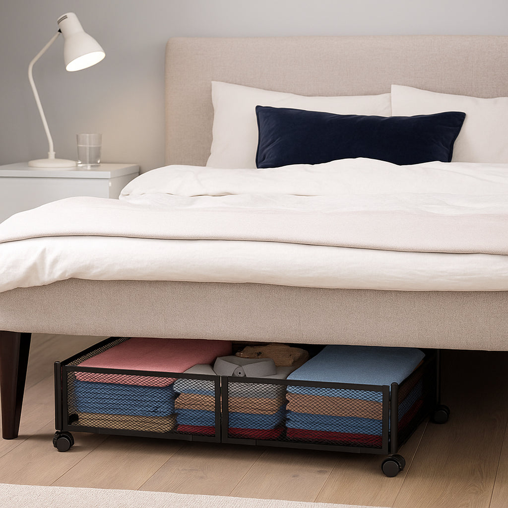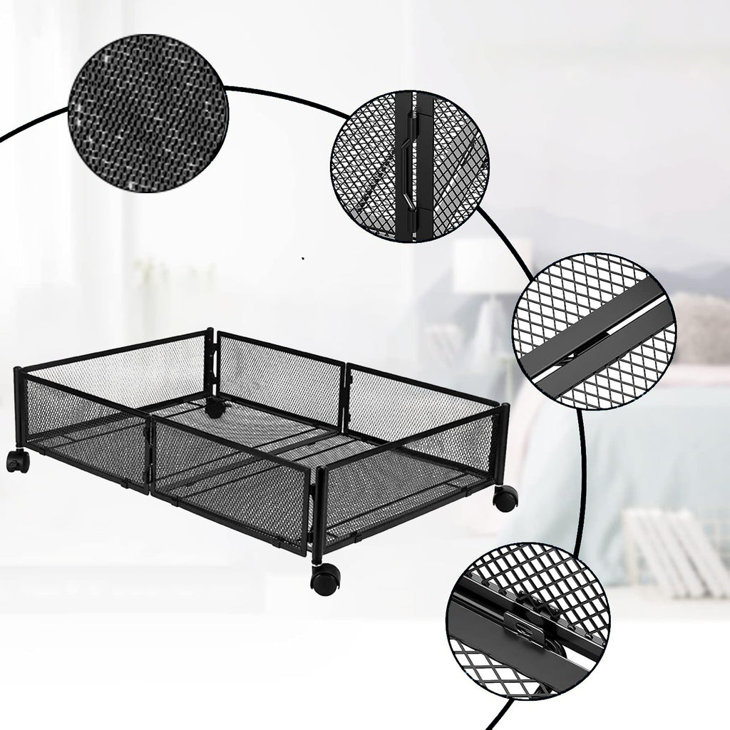 - Declutter your space and make the most of unused areas with the Under Bed Storage Organizer with Wheels. Designed with durable black steel and a stylish grid frame, it provides a sturdy, breathable solution for storing shoes, blankets, seasonal clothes, or household essentials.