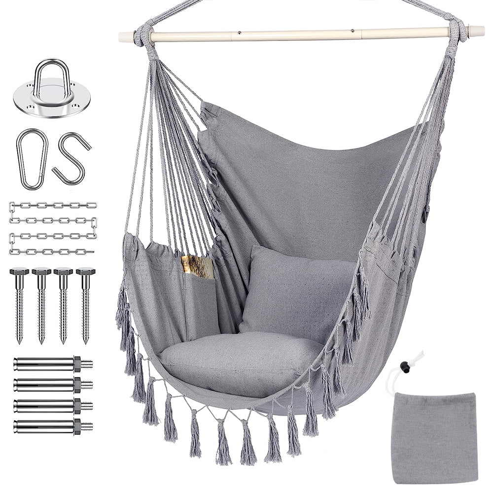 Experience unparalleled comfort with our Hammock Chair Hanging Rope Swing, meticulously crafted from premium cotton and sturdy steel. Whether indoors or outdoors, its lightweight design allows for effortless movement, while fashionable tassels add a touch of elegance to any space. With a weight capacity of up to 160kg and easy installation using stainless steel hardware, enjoy a secure and tranquil retreat wherever you choose to hang it.