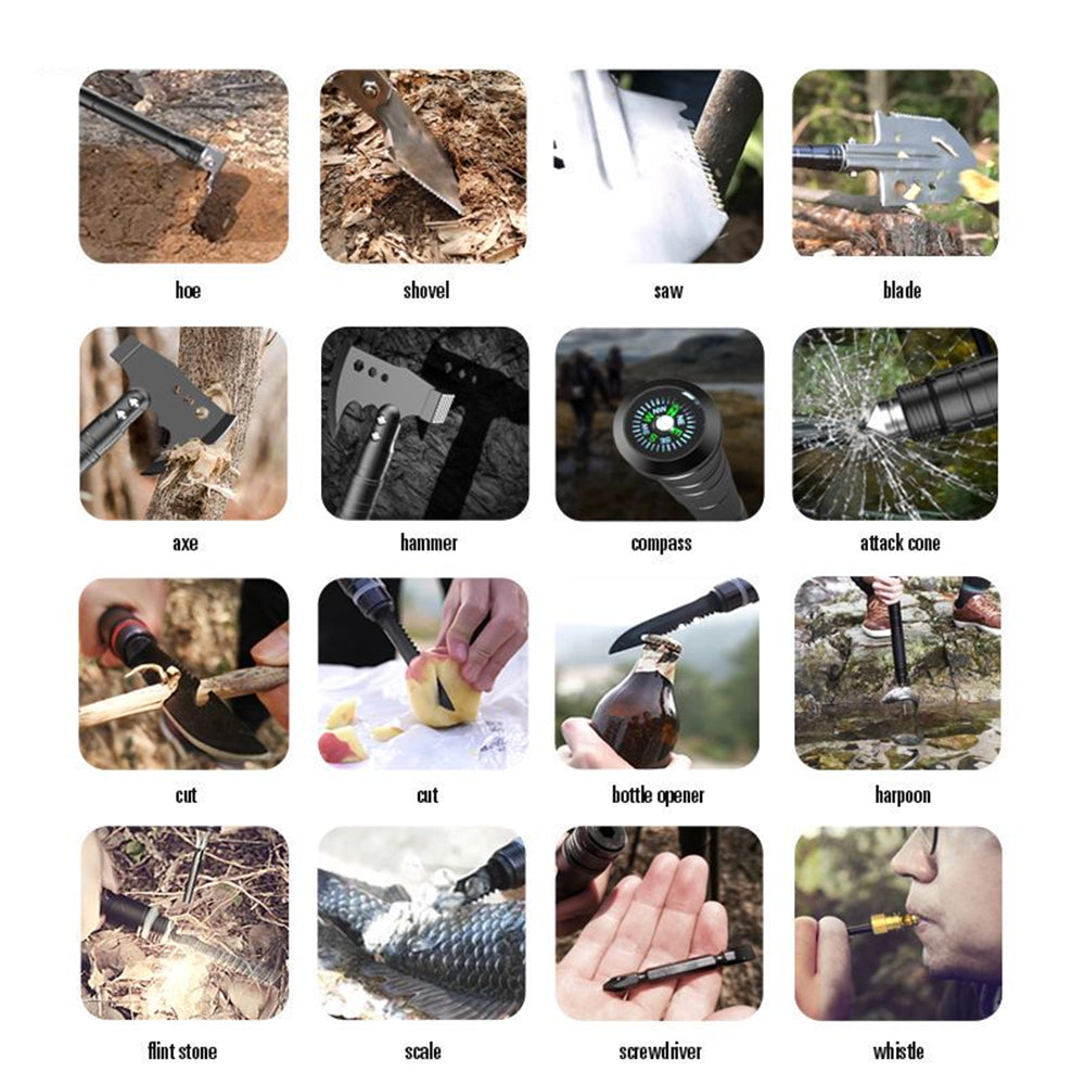 Elevate your outdoor experience with the Multifunctional Shovel, crafted from durable aluminum alloy for reliability in any condition. From digging to cutting, chopping, and beyond, its versatility makes it indispensable for various activities. Adjustable length and compact assembly ensure comfort and convenience, while its multifunctionality makes it an ideal gift for wilderness enthusiasts. Prepare for any adventure with this essential tool for outdoor survival and exploration.