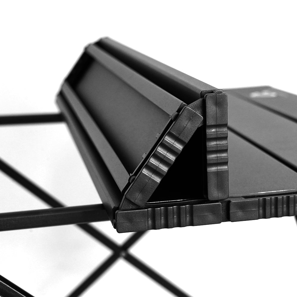 The portable camping table is designed with crossed legs and a flat top, ensuring a stable and reliable work surface. All four legs are equipped with non-slip feet, keeping the tabletop steady even on uneven ground. The table legs are crafted from high-strength aluminum alloy, offering excellent bearing capacity and resistance to bending and deformation.