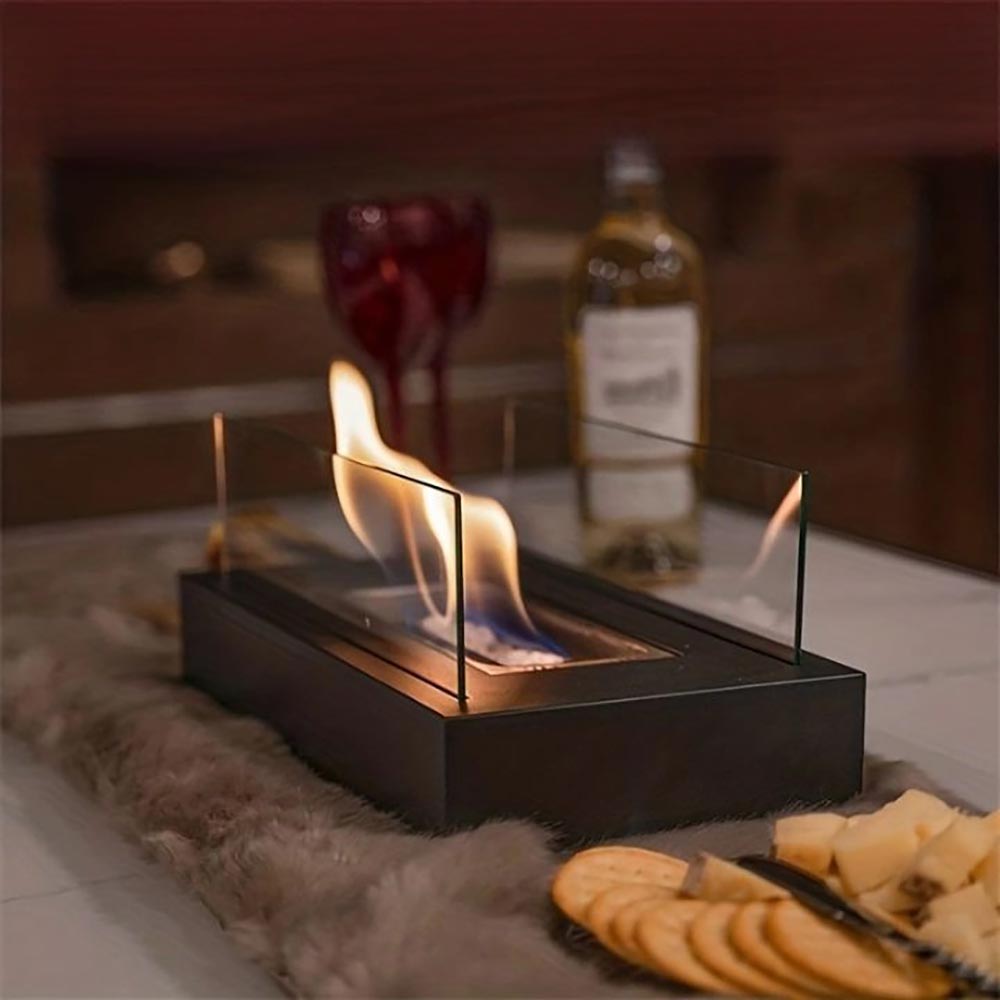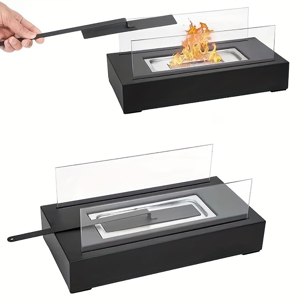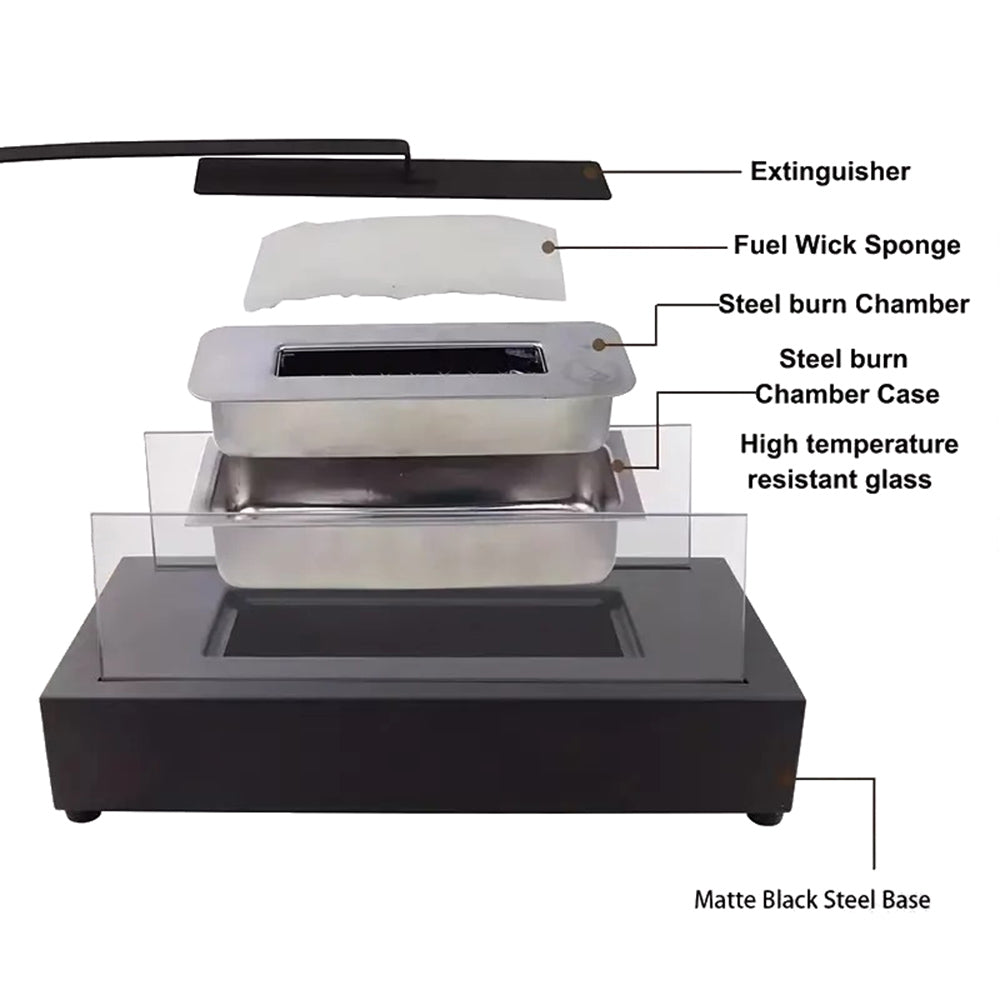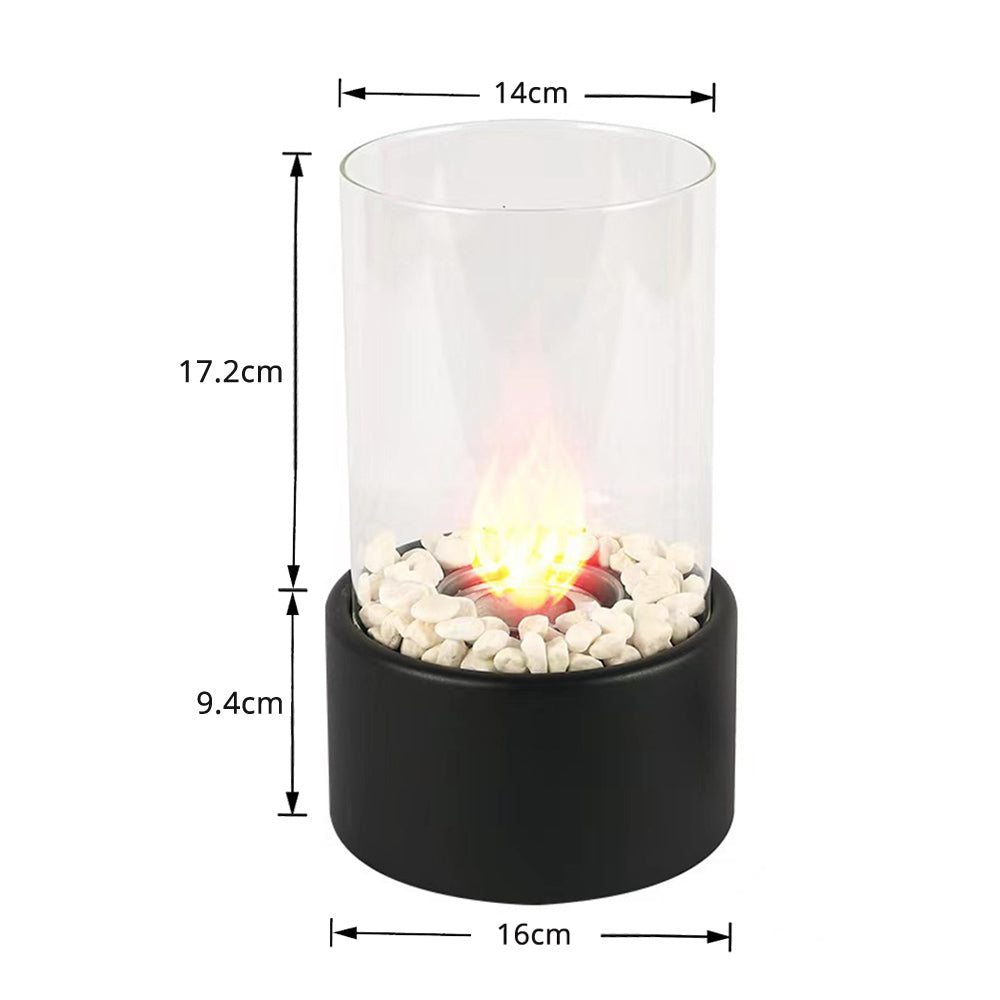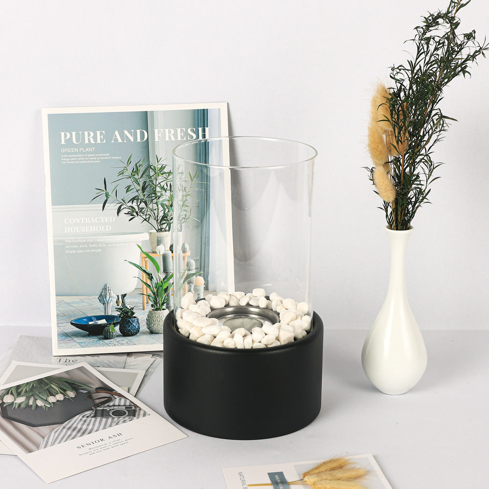 - The table fireplace is presented in a modern black metal housing. Behind the transparent, removable high temperature resistant glass tube, you can observe the impressive flame play from 360°, creating a stylish and fascinating effect.