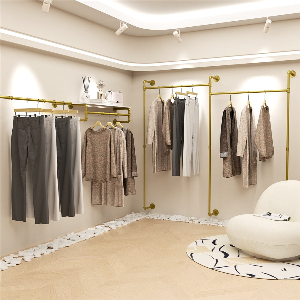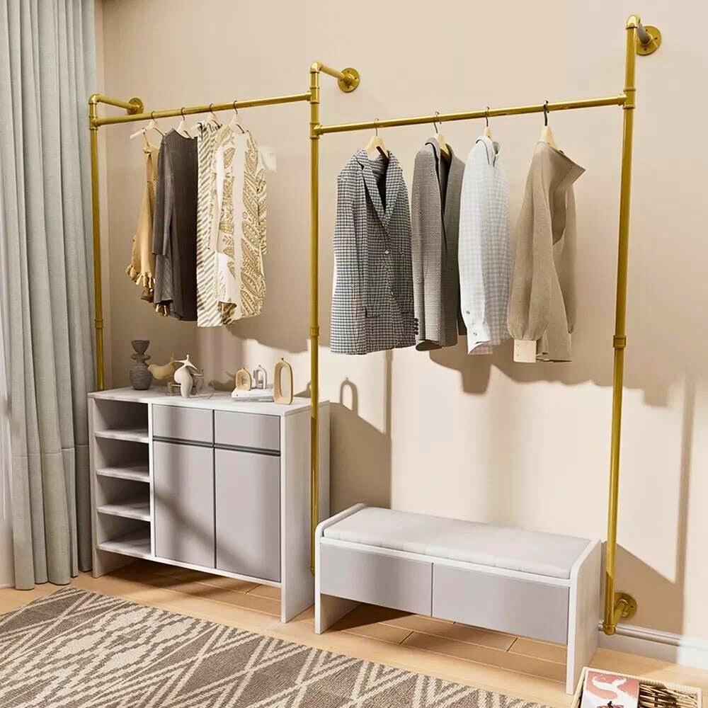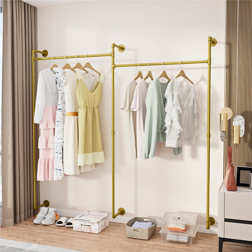 - The elegant and glossary gold finish can be matched with many styles. It has a simple design that can enhance the look of any retail or personal space and update your storefront or closet. This clothing display rack is mounted to the wall with expansion screws and can hold a maximum weight of 30kg. This allows more clothes to be hung.
