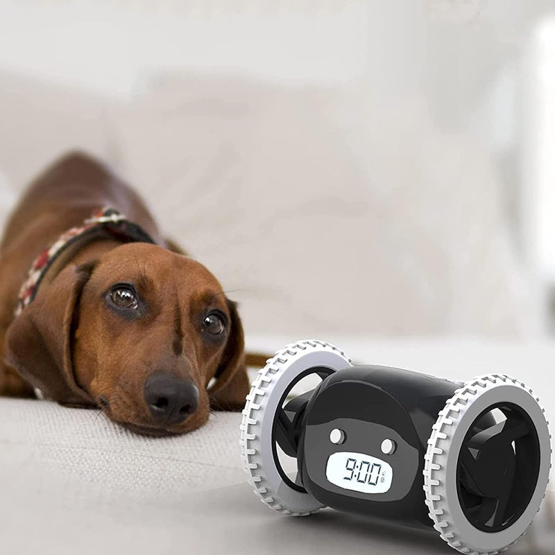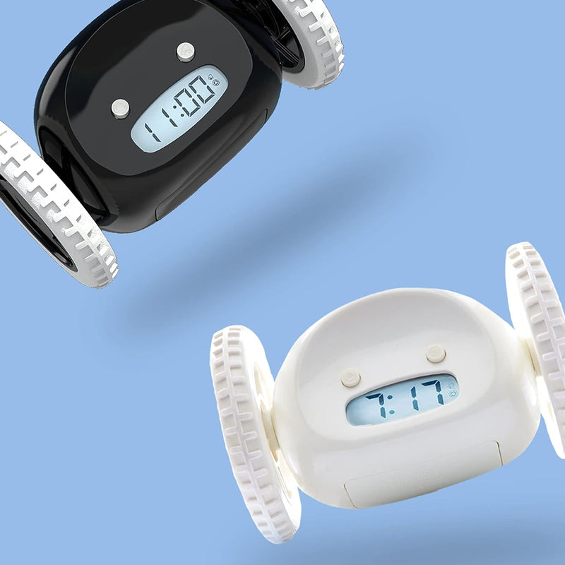 - You can snooze one time (for 1-8 minutes), or turn off the snooze feature. The digital flying moving very loud alarm clock with wheels, will light up in the dark and leap into action when it's time to get up and you'll chase it.