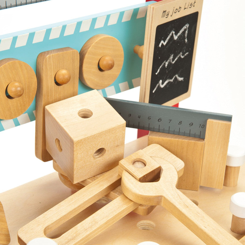 - Includes wooden play tools: saw, spanner, hammer, screwdriver, and carpenter's blackboard