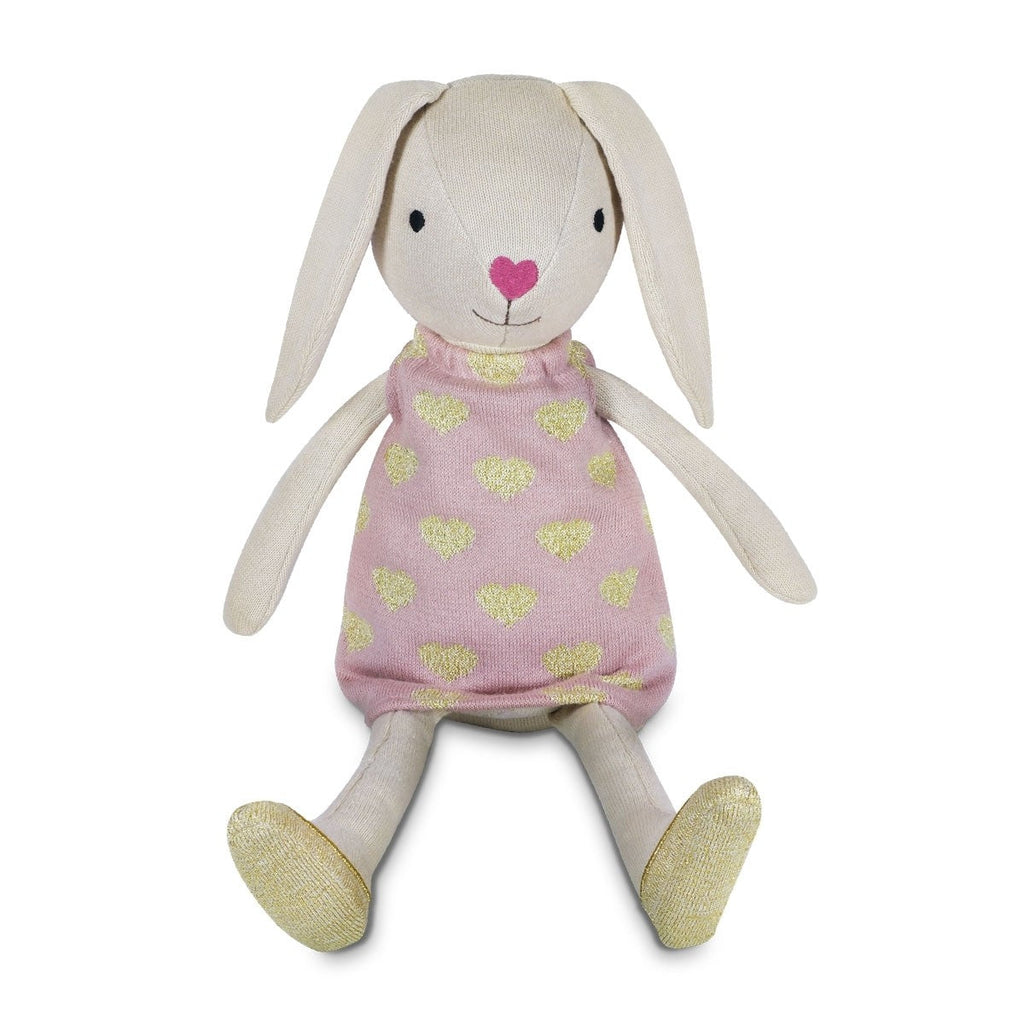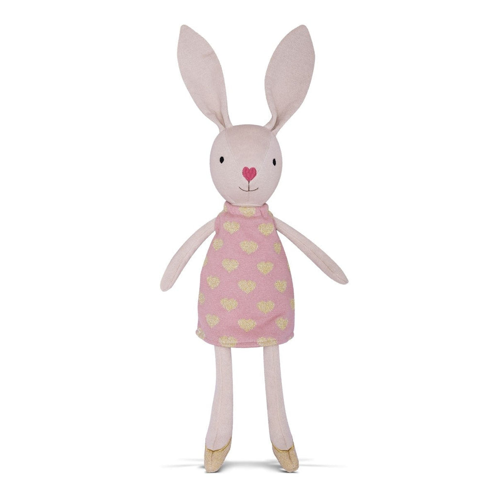 Luella is an adorably soft and cuddly bunny made from certified organic cotton knit fabric, filled with organic cotton for a safe and organic experience. Featuring removable clothing and extra-long, floppy ears, this plush toy is designed to offer a wonderfully textured and classic feel. Luella's embroidered nose, mouth, and eyelashes add to her charm. Her dress is made from organic cotton, featuring pattern highlights finished with a non-cotton glitter thread. This bunny is 42 cm high and comes attached by cotton straps to a branded hang tag.