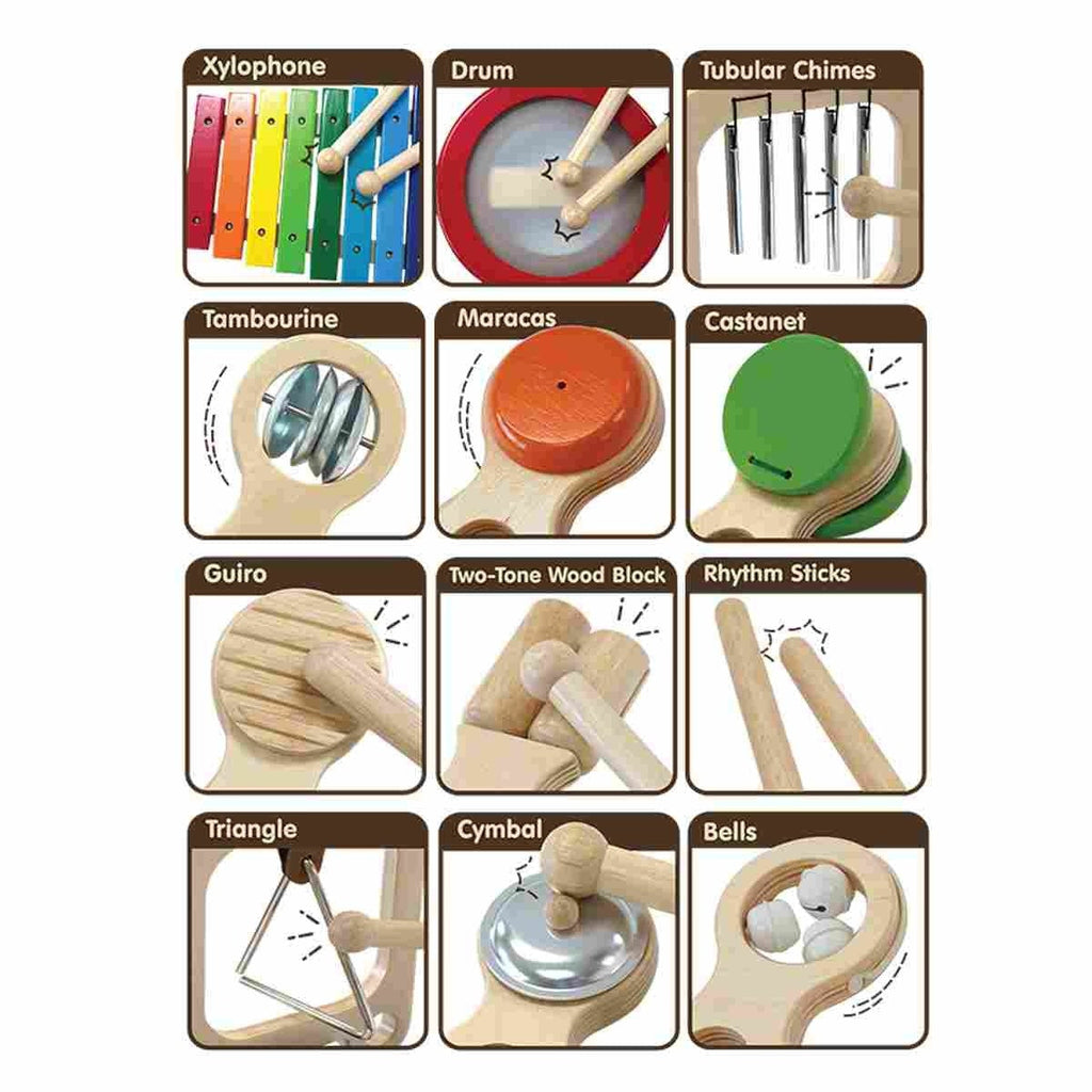 - Includes 10 sound and music experiences: xylophone, tubular chimes, triangle, cymbal, bells, maracas, castanet, double guiro, rhythm sticks, strikers, and a scraper.