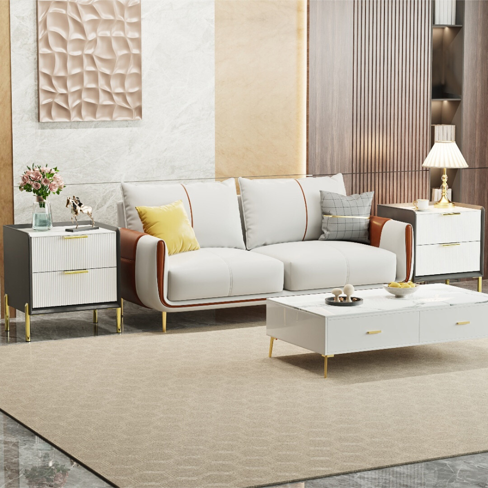 - Crafted from robust slate and E1 grade MDF board, the bedside table presents a sleek, modern look that is further enhanced by gold accents on the handles and legs. The drawers, constructed from natural pine, feature silent 3-section damping slides for smooth and quiet operation. Encased in soft, fade-resistant grey PVC leather, which is hand-applied for an exquisite finish, the table’s design is both elegant and functional. The widened aluminum drawer handles, gently curved for ergonomic ease, facilitate effortless access to the drawers.