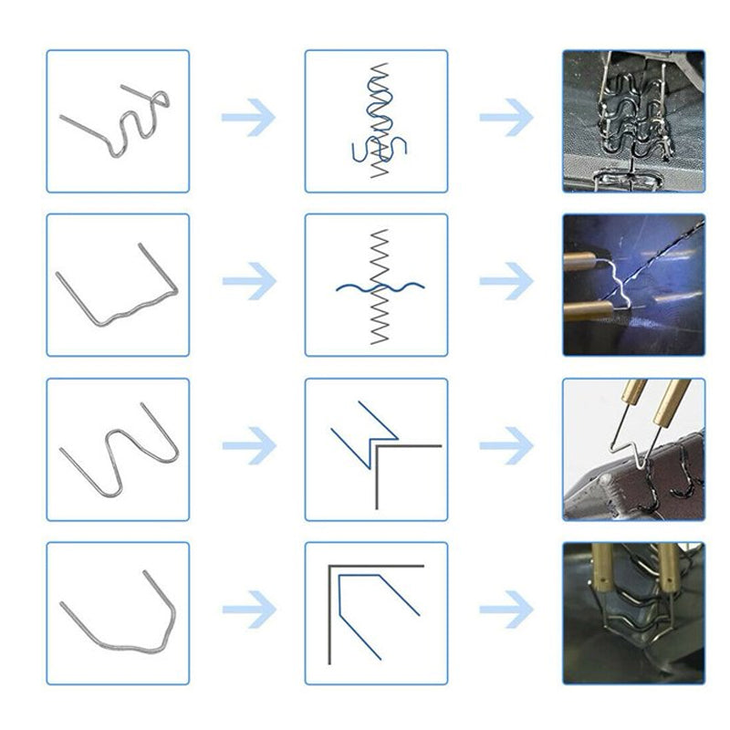 - These welding staples are made of made of high-quality stainless steel. It has good hardness and toughness and is easy to process. It is usually used with a hot stapler to repair and weld plastic parts or repair car bumpers.