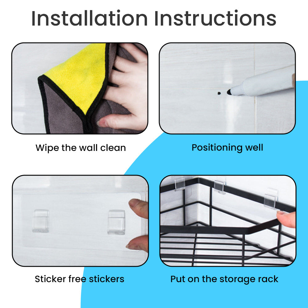 Optimize bathroom storage with this set of 2 corner caddies, providing up to 40lbs capacity without wall damage. Made of anti-rust carbon steel with thick wire, this shower rack ensures durability and a long-lasting shine. Install effortlessly with adhesive, avoiding suction cups, and use a hair dryer for damage-free removal.