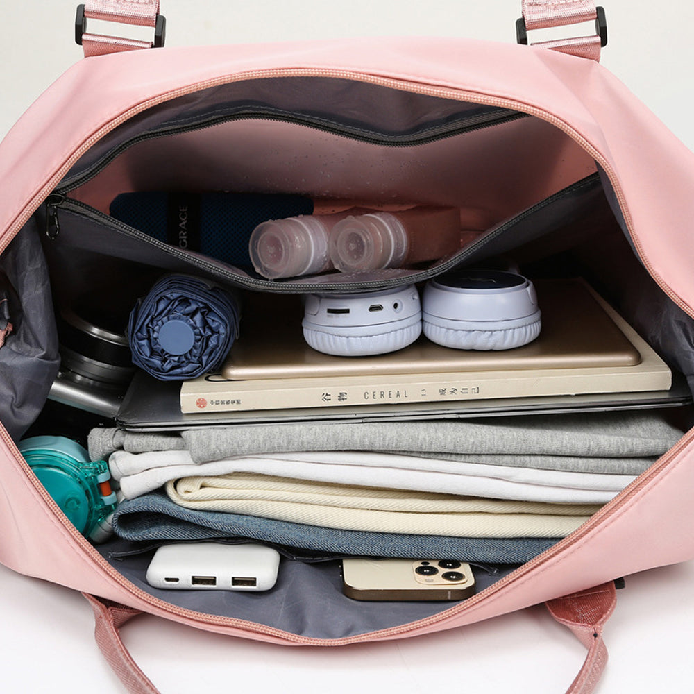 - This is the perfect carry-on bag for air travel, gym, and other outdoor activity. It comes with a large capacity and separate compartments, letting you bring all your stuff in one bag.