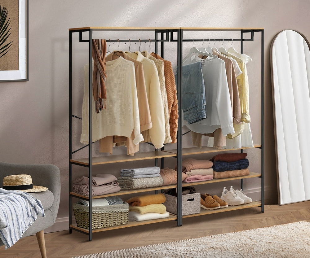 - The wardrobe features four sturdy shelves alongside a metal hanging rail, providing ample space for folded clothes, accessories, and hanging garments. This combination creates a functional and adaptable storage unit that suits a variety of needs, whether in the bedroom, dressing area, or even as a multipurpose display or plant stand.