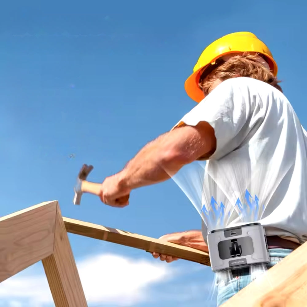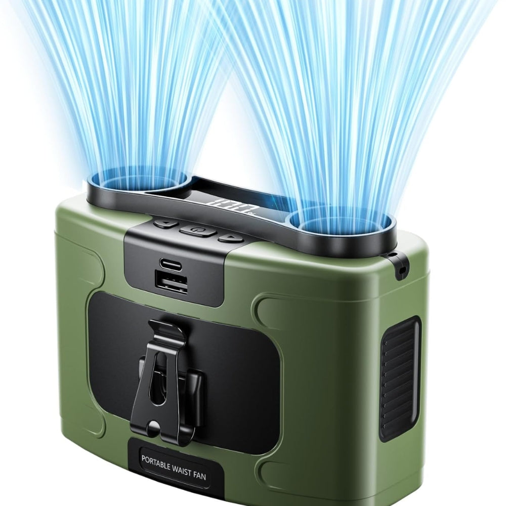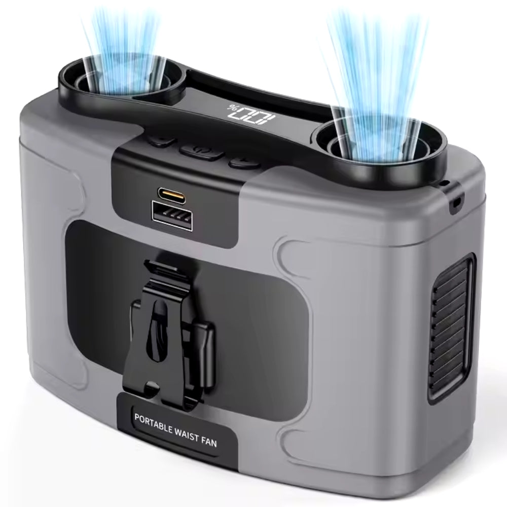 - This waist fan ensures hours of refreshing airflow. Its versatility shines with built-in features like a flashlight and power bank, providing more than just cooling relief.The 3-in-1 portable outdoor waist fan offers a powerful solution for staying cool during hot weather, making it the perfect companion for outdoor adventures. Equipped with a robust 20000 mAh motor and speeds up to 16000 RPM. With an upgraded brushless motor, the fan delivers a comfortable, cooling breeze ideal for hot summer nights. It features a Type-C charging port for fast recharging, and an LED digital display helps you monitor gear settings and battery levels. The innovative waist buckle design allows you to wear the fan on the front, back, or side, making it easy to carry wherever you go.