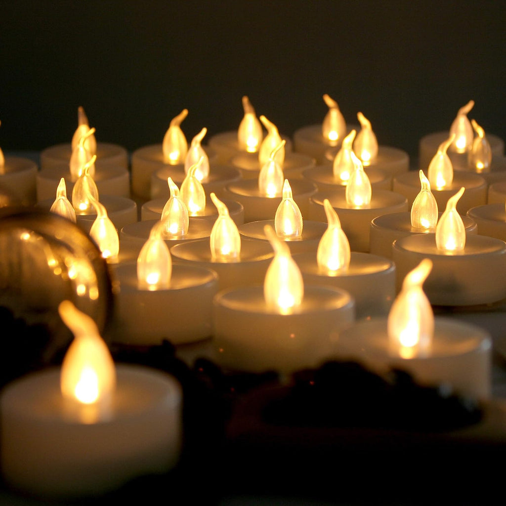 - The tealights are available in 2 different light colors, the romantic warm yellow light and flickering flame effect will provide you with a real candlelight environment. While the cool white light provides a pristine and bright effect for lively occasions.
