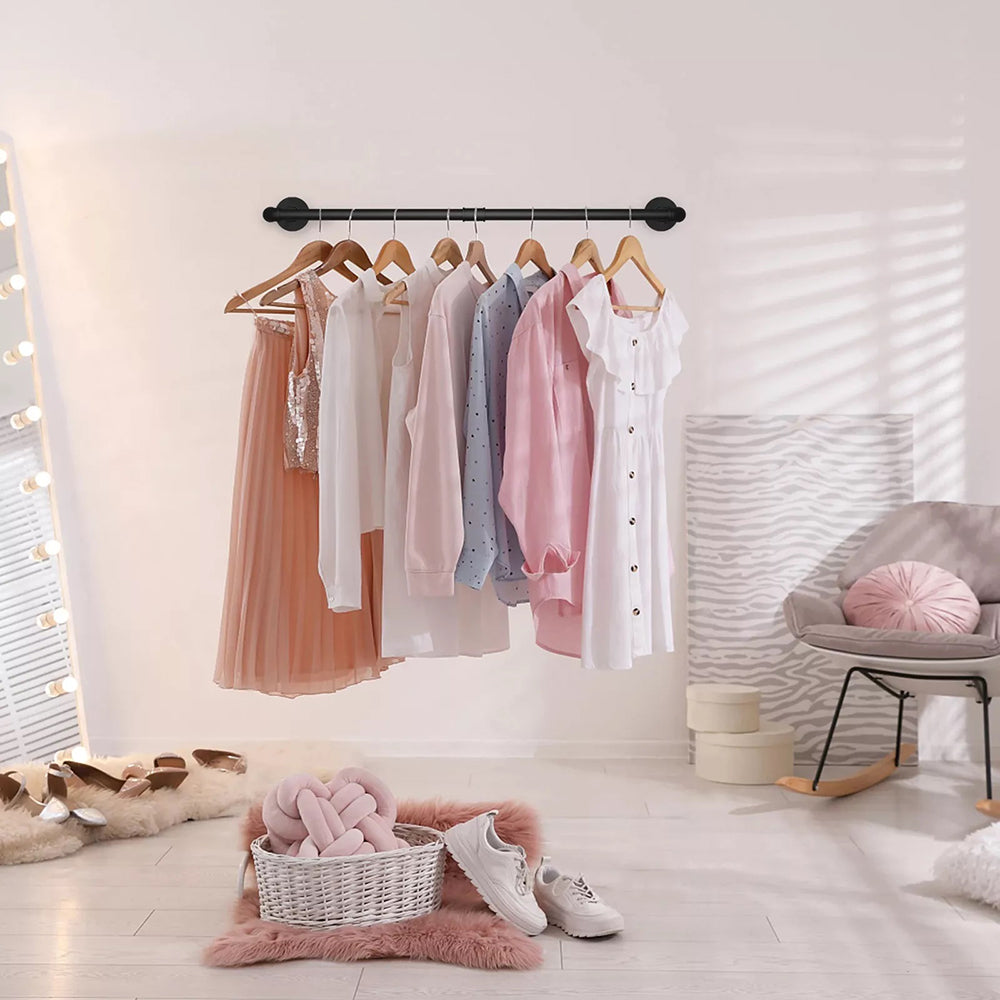 - These racks create extra space to organize and display your everyday clothes or seasonal outfits, helping you keep your space neat and clutter-free. Constructed from black painted metal iron with electrostatic painting, these racks are not only stylish but also high in strength and durability. Each rack comes with 4 free hooks for hanging small objects such as necklaces, offering added convenience and organization. Simple to assemble, these pipe racks can be put together following the provided instructions, making setup quick and hassle-free.