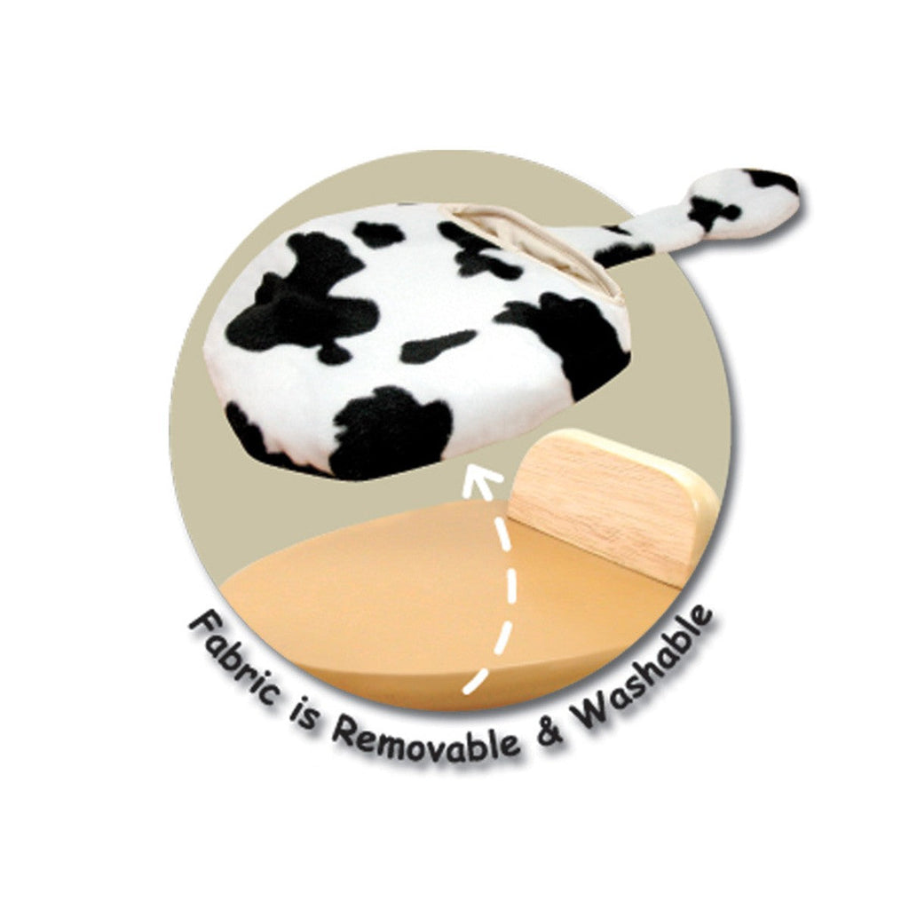 This adorable ride-on cow in a sturdy wooden trike configuration features a steerable front wheel and a comfortable seat, perfect for little riders. The seat cushion is removable and washable, while the cow includes soft fabric ears, a fabric tail, and EVA rubber trimmed wheels for smooth movement. Made from organic rubber wood with a composite timber seat, this ride-on toy is designed to be both fun and safe. The non-toxic, child-safe paints and lacquers ensure peace of mind for parents. Adult assembly is required, with some parts partially assembled in the box.