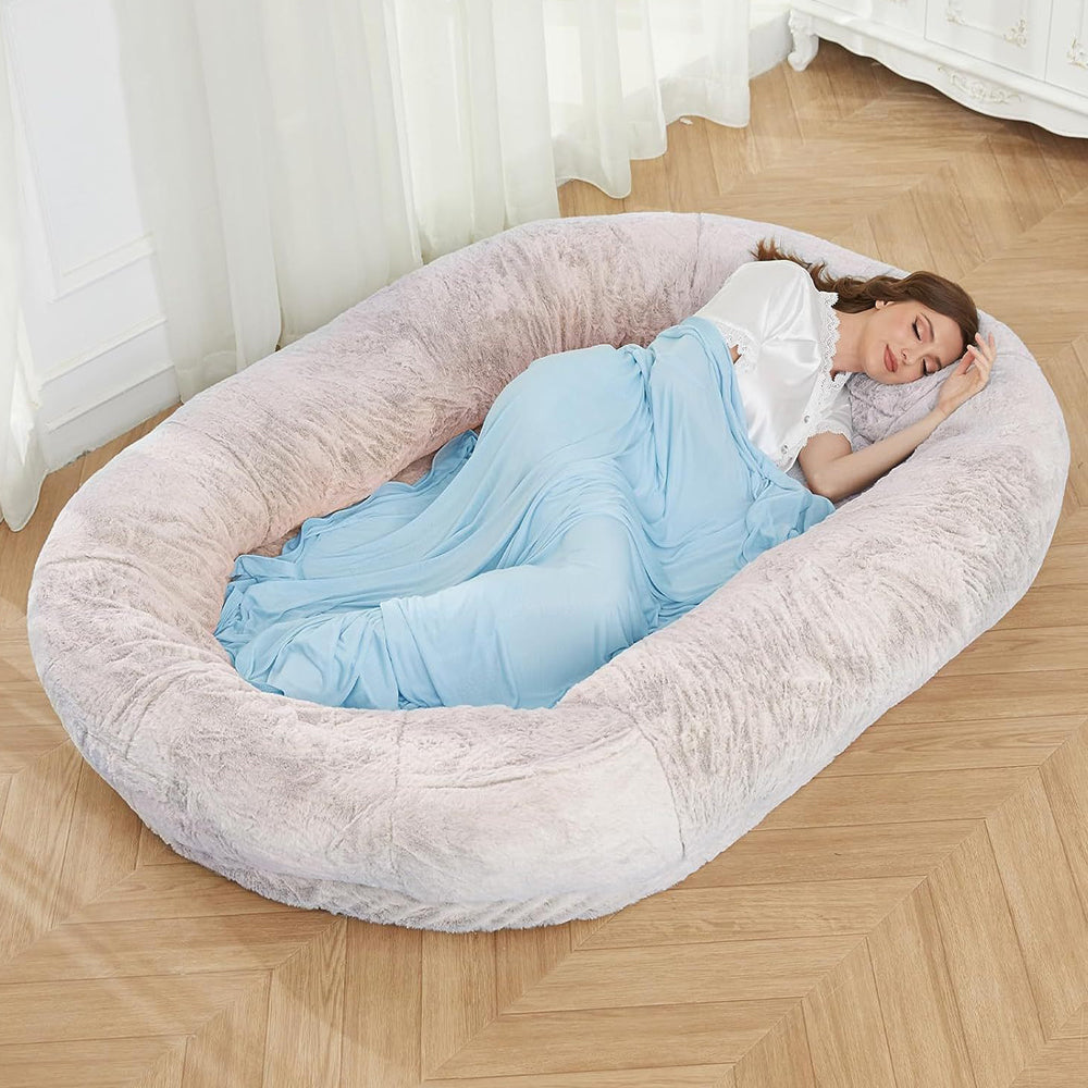 - We understand the importance of comfort, which is why our Human Dog Bed is crafted with premium materials. The silky short plush cover offers both durability and a luxurious touch. Beneath the surface, high-density foam padding ensures exceptional support and retains its shape even with prolonged use.