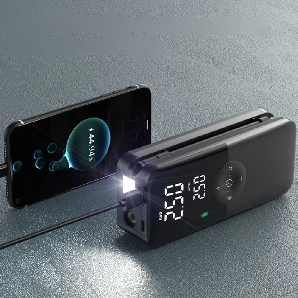 - The multifunctional design also includes an emergency power bank feature, allowing you to charge devices on the go. Combining dependable performance, intuitive controls, and excellent portability, this tire inflator is an essential companion for drivers, cyclists, and sports enthusiasts.