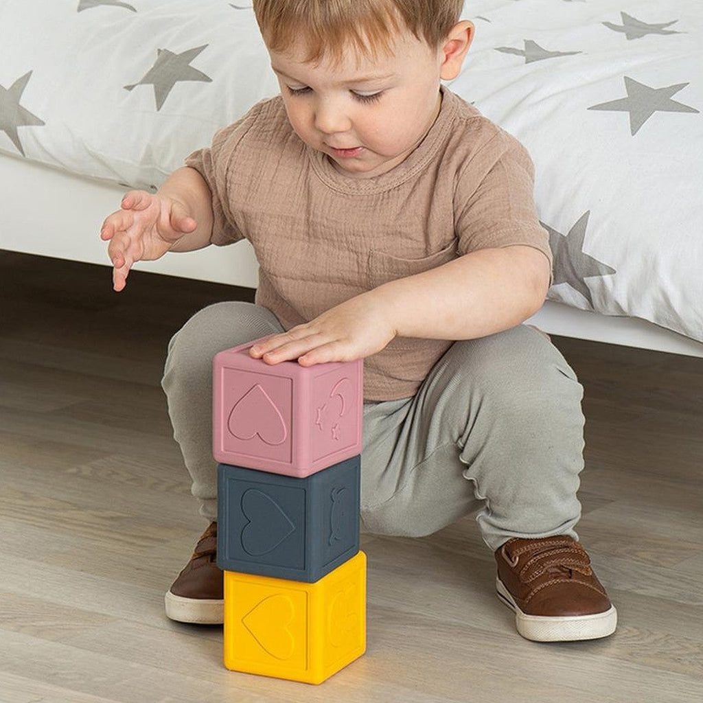 The Sensory Cubes are designed to engage young children in tactile exploration and sensory development. Made from smooth, food-grade silicone, each cube features a different pattern on every face, including a bunny rabbit, sun, moon, stars, and more. This set of three cubes also serves as an introduction to stacking toys, helping to improve grasp and release skills, dexterity, and hand-eye coordination. Styled in soft neutral colours, they make a beautiful addition to any nursery. Part of the award-winning Simply Scandi collection. Made from food-grade silicone and coloured with non-toxic paints and lacquers.
