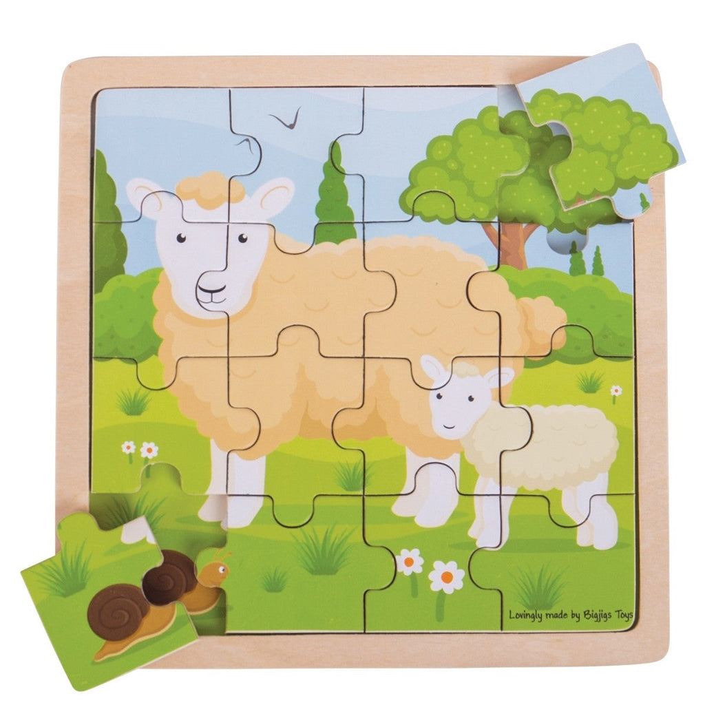 The Bigjigs Wooden Sheep & Lamb Puzzle is an adorable toddler puzzle featuring a mother sheep watching over her baby lamb. Little ones must match each brightly coloured wooden piece to the correctly shaped slot on the wooden base board, which is printed with the completed puzzle image for guided learning. The chunky wooden pieces are designed for small hands to lift, grasp, and replace, making playtime both fun and educational. This puzzle helps develop dexterity, matching skills, concentration, and vocabulary recognition.