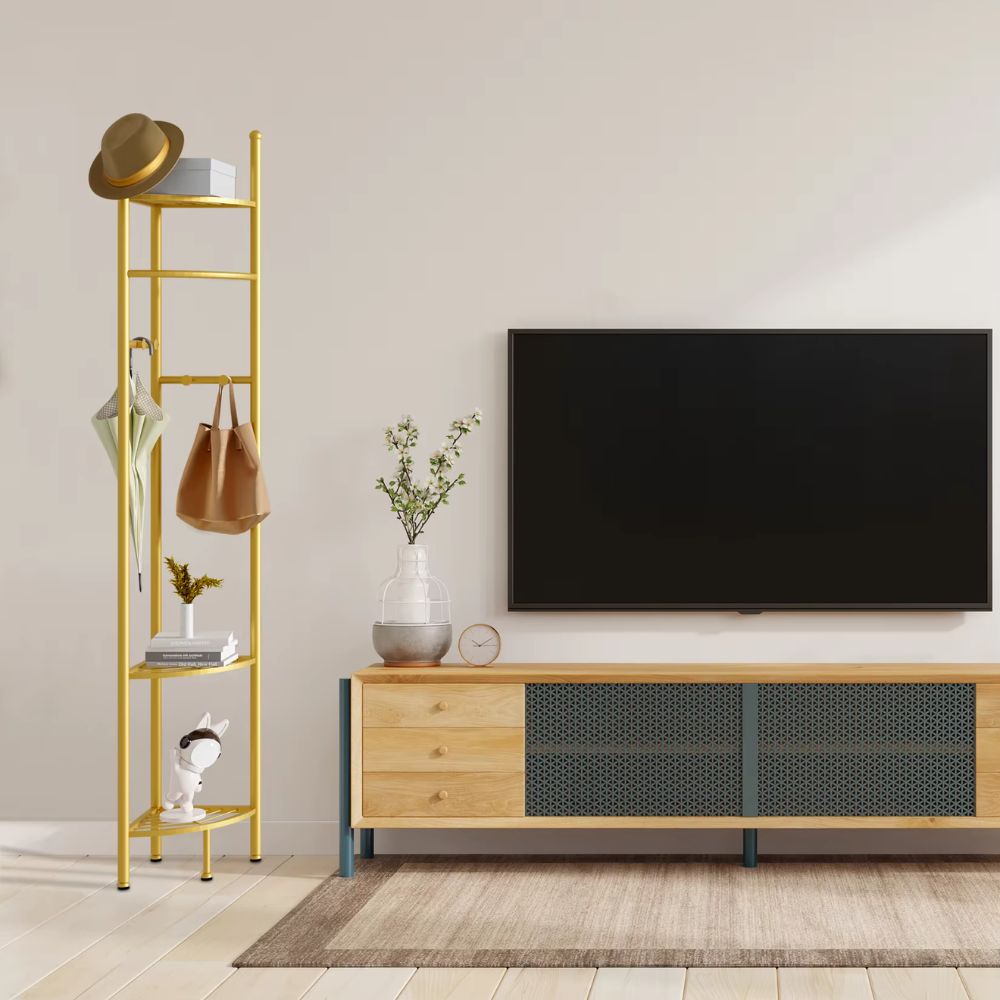 - Its corner design maximizes room efficiency by fitting neatly into tight spaces. Whether you're looking to tidy up your entryway or add extra storage in your living room, this piece is both functional and stylish. Made from durable metal, the coat stand is built to last while adding a modern touch to your decor. It’s a practical solution that combines functionality with a sleek, minimalistic look.