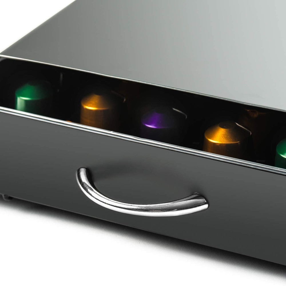Organize and access your Nespresso capsules effortlessly with this sleek drawer pod holder, accommodating up to 60 capsules while saving space. Crafted from durable iron with a black powder-coated finish, it offers both durability and easy maintenance. Compatible with most coffee pod machine models, it fits neatly under your machine for added convenience. Plus, its stylish design seamlessly blends into any decor, elevating your coffee setup with elegance.