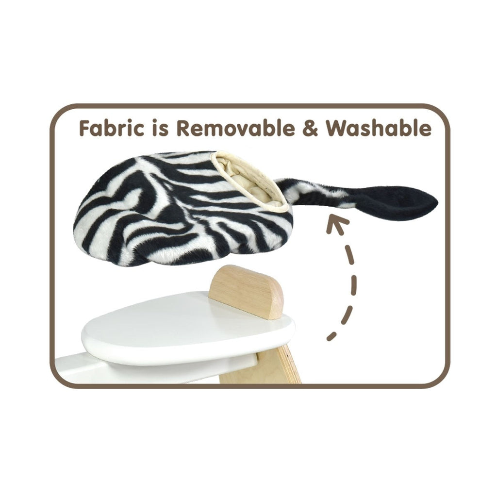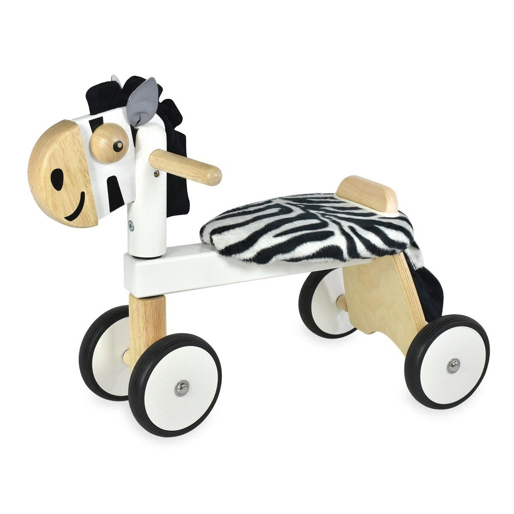 - This colourful ride-on zebra combines fun and functionality in a sturdy wooden trike configuration. Featuring a steerable front wheel and a comfortable seat, it offers a smooth ride for young children. The seat cushion is removable and washable, and the toy includes soft fabric ears and a fabric tail for added charm. The EVA rubber trimmed wheels ensure a safe and smooth experience, while the non-toxic, child-safe paints and lacquers add to its durability and safety.