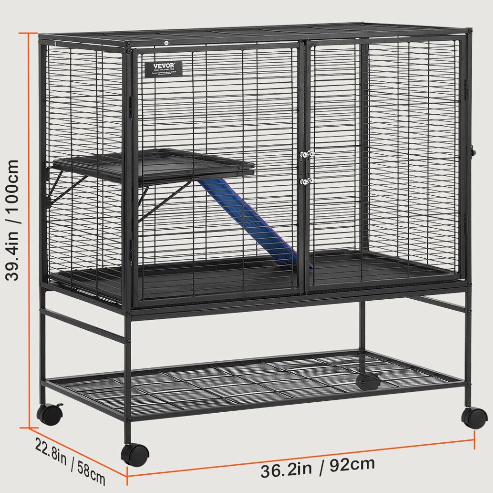 - This spacious ferret cage is designed to give your pets a comfortable and engaging environment. The ample room ensures your pets have a dynamic space for both exercise and relaxation.Built with reinforced thick metal square tubes, this cage offers exceptional stability and durability. Its fine powder coating and seamless welding provide excellent rust resistance, making it a long-lasting option for your pets. Cleaning this ferret cage is a breeze, thanks to its removable platforms and grids. The thoughtful design allows for quick maintenance, keeping the space hygienic for your pets.