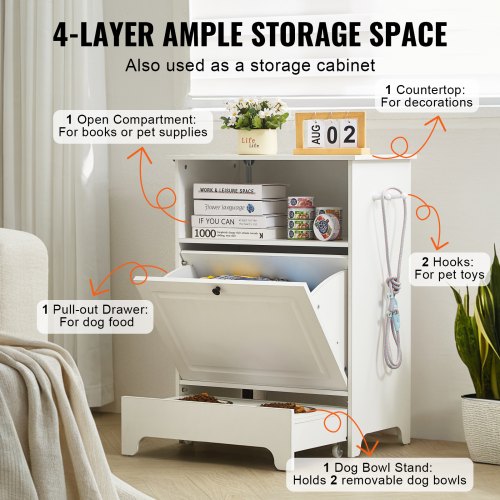 Ample Storage Space: This raised dog bowl stand also serves as a large storage cabinet, accommodating all your pet supplies. The two side hooks can hold toys and leashes, the pull-out cabinet stores food bags, and the shelves and top surface are perfect for decorations, books, cans, pet coats, or treats.