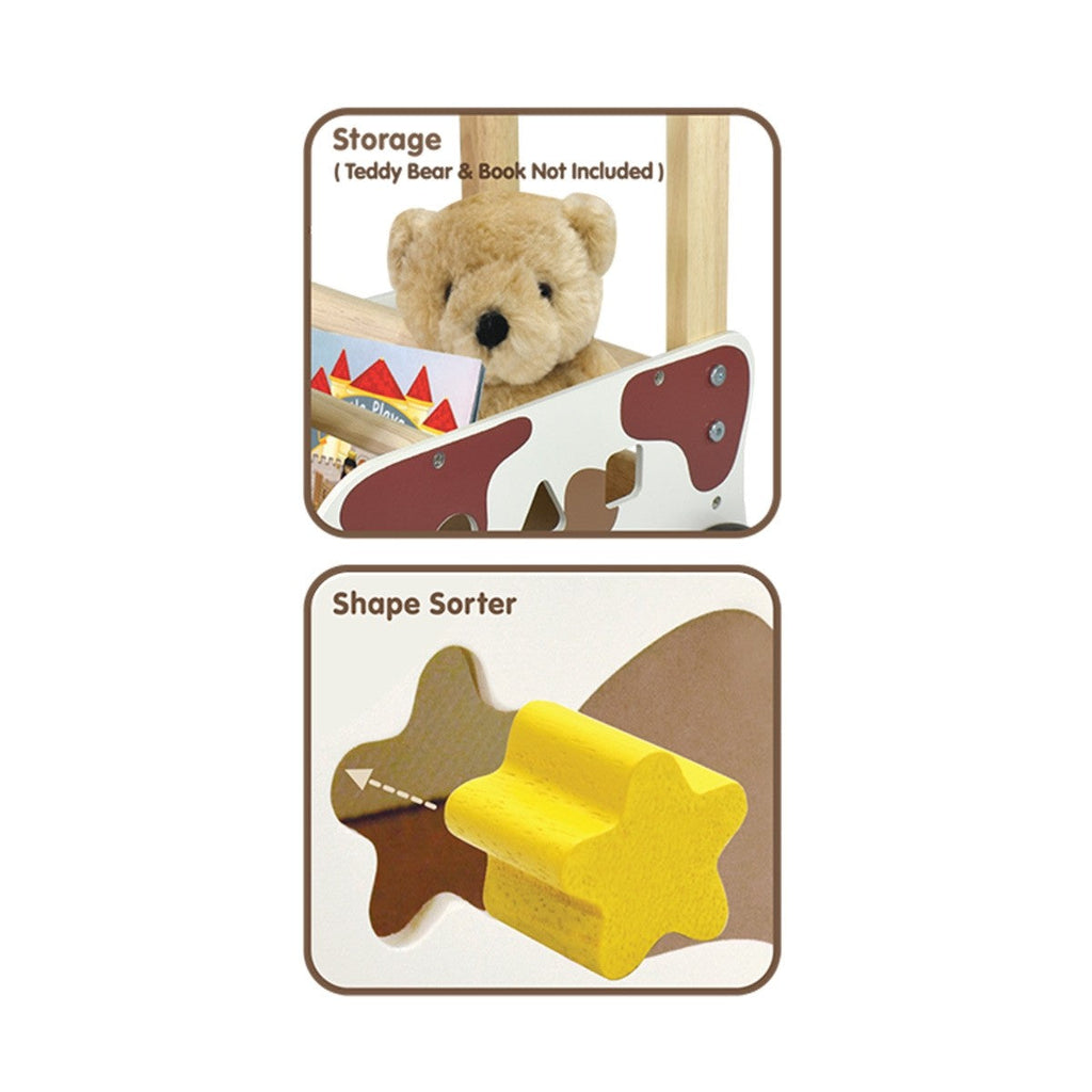 This sturdy wooden ride-on walker is designed to help little ones learn while having fun. It features shape sorting side panels with six shape sorting blocks, and the seat lifts off for easy storage of the blocks and other favorite items. The walker includes EVA rubber-trimmed wheels for floor protection, soft fabric ears for added charm, and easy-grip handles for safety. Made from organic rubber wood and non-toxic, child-safe paints, this toy promotes motor skills and provides endless hours of enjoyment. Adult assembly required, with some parts partially assembled.