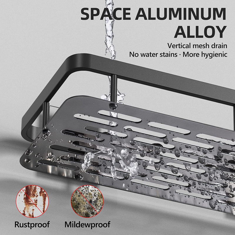 Upgrade your shower organization with our drill-free shower tray, crafted from lightweight yet durable aluminum alloy. With a robust design capable of holding up to 20 kg, it can accommodate oversized containers and heavy bottles without worry. The open mesh design allows for water drainage, preventing bacterial growth and maintaining cleanliness.Rust-proof, scratch-resistant, and corrosion-resistant, it ensures long-lasting use. Easy to install on any clean, smooth wall, it leaves no marks upon removal. Versatile for use in bathrooms, bedrooms, kitchens, and more, it's perfect for storing toiletries, spices, snacks, and household items.