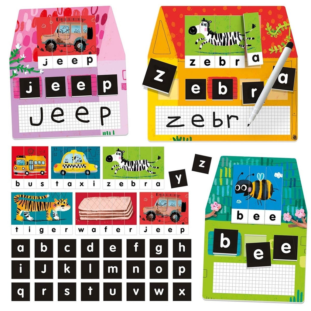 - This kit teaches them to read, write and spell simple words. Assemble a series of word puzzles using an enclosed spelling template, then learn to write these words using an enclosed erasable pen. Contains 72 letter disks, 18 puzzles, an erasable felt pen, 3 mini whiteboard templates and a guidesheet for parents and educators. Made from chunky cardboard.
